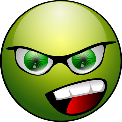 A cartoon face with an angry look and its mouth partially open.